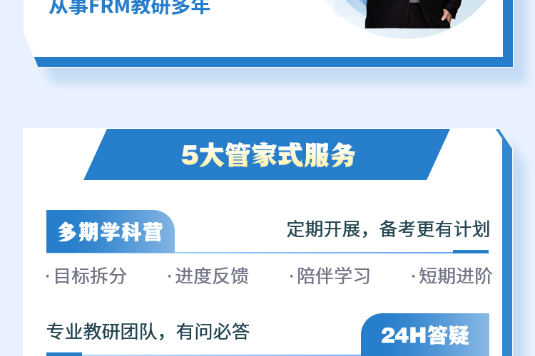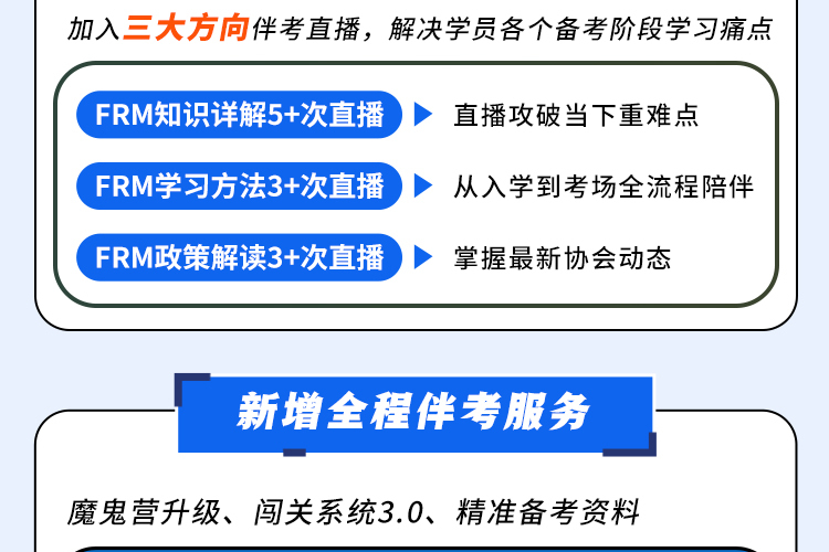 【适用人群】 想节省复习时间,信任品职,一次性支付无压力,决心通关考试,希望总体费用最划算(比较与单独报名二个级别全线班) 2026年5月开始FRM一、二级联考考生