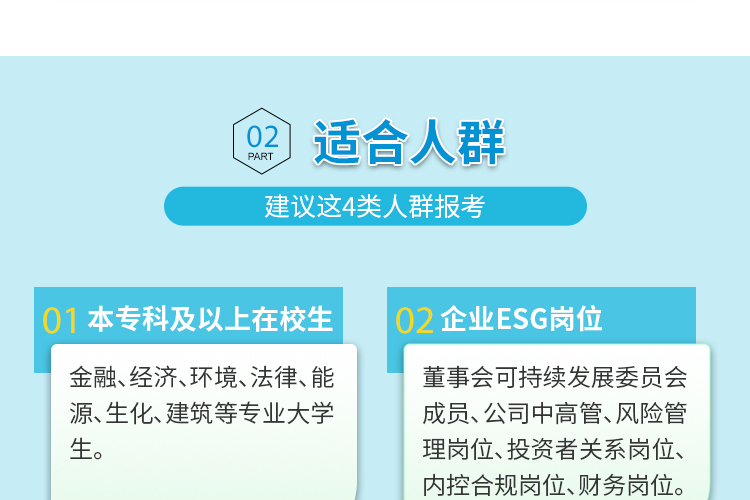 董事会可持续发展委员会成员、公司中高管(CEO、CFO、CIO、CRO等)、风险管理岗位、投资者关系岗位、内控合规岗位、财务岗位。